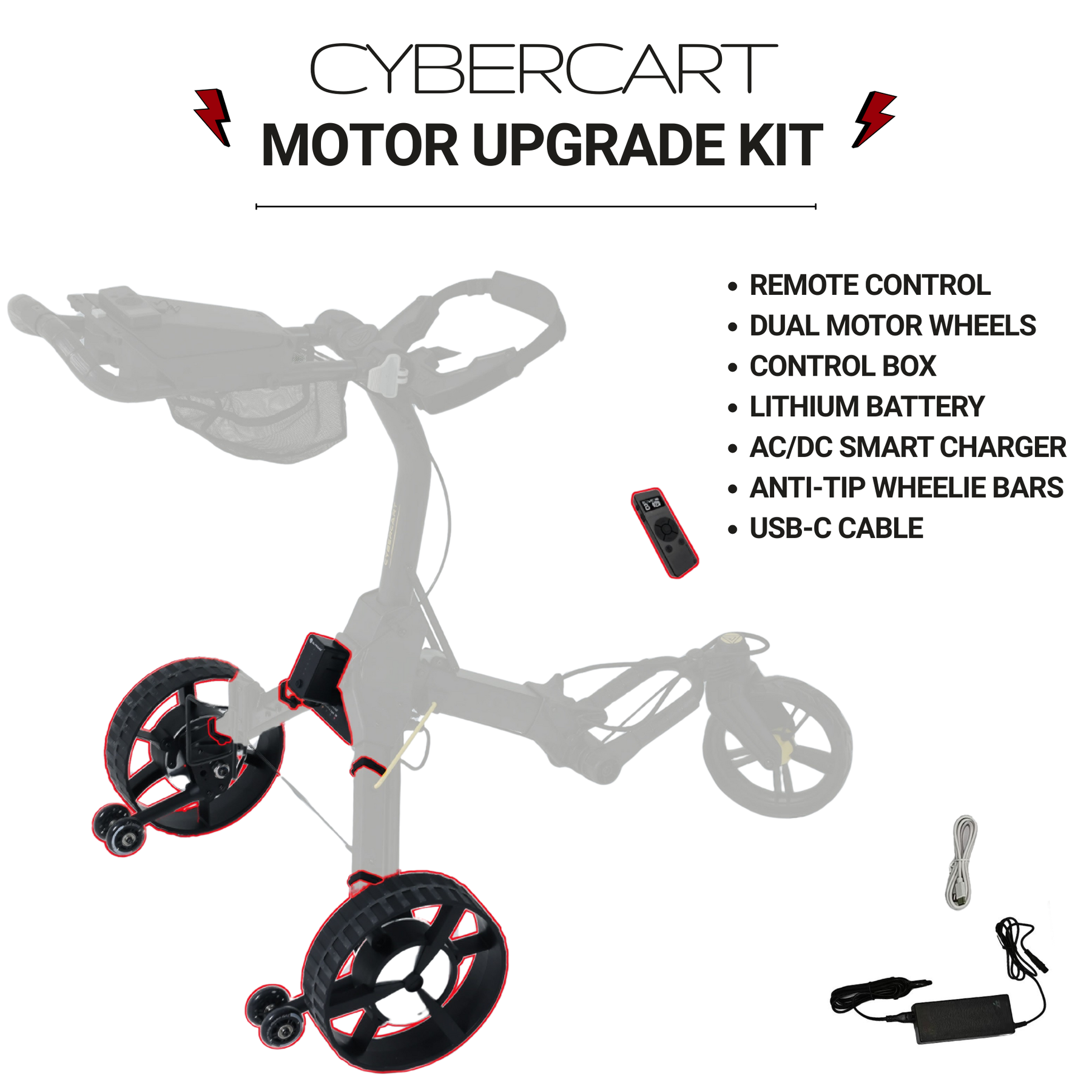 Transform your Cybercart Push+ manual push cart into a fully motorized, remote-controlled caddy with the Cybercart Motor Upgrade Kit.
